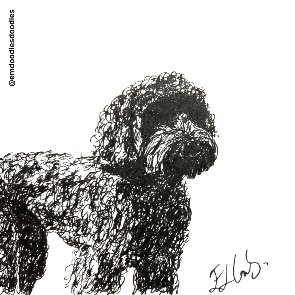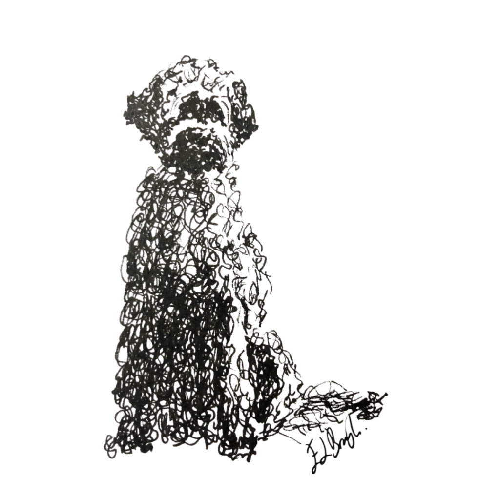 Hand-drawn pen-and-ink drawings of labradoodles, cockerpoos and other poodle-related breeds.